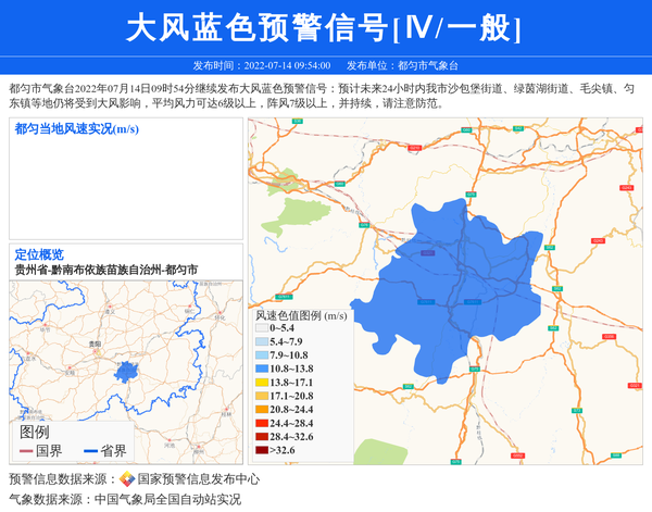 都匀市气象台2022年07月14日09时54分继续发布大风蓝色预警信号:预计未来24小时内我市沙包堡街道、绿茵湖街道、毛尖镇、匀东镇等地仍将受到大风影响,平均风力可达6级以上,阵风7级以上,并持续,请注意防范。 信息来源:国家预警信息发布中心; 发布单位:都匀市气象台。