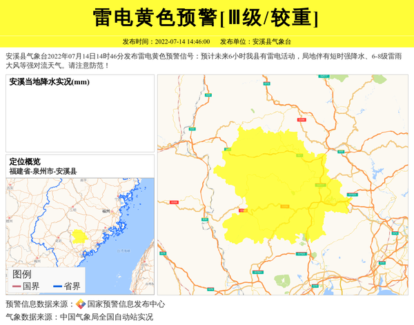 安溪县气象台2022年07月14日14时46分发布雷电黄色预警信号:预计未来6小时我县有雷电活动,局地伴有短时强降水、6-8级雷雨大风等强对流天气。请注意防范! 信息来源:国家预警信息发布中心; 发布单位:安溪县气象台。