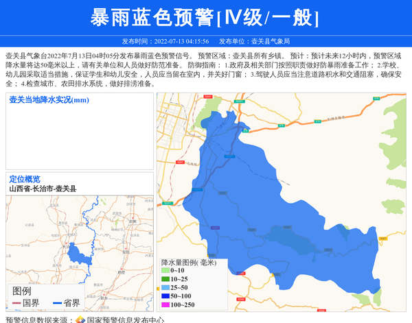 壶关县气象台2022年7月13日04时05分发布暴雨蓝色预警信号。 预警区域:壶关县所有乡镇。 预计:预计未来12小时内,预警区域降水量将达50毫米以上,请有关单位和人员做好防范准备。 防御指南: 1.政府及相关部门按照职责做好防暴雨准备工作; 2.学校、幼儿园采取适当措施,保证学生和幼儿安全,人员应当留在室内,并关好门窗; 3.驾驶人员应当注意道路积水和交通阻塞,确保安全; 4.检查城市、农田排水系统,做好排涝准备。 信息来源:国家预警信息发布中心; 发布单位:壶关县气象局。