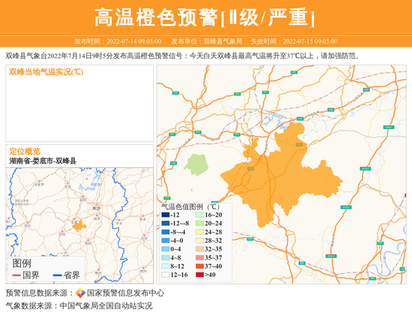 双峰县气象台2022年7月14日9时5分发布高温橙色预警信号:今天白天双峰县最高气温将升至37℃以上,请加强防范。 信息来源:国家预警信息发布中心; 发布单位:双峰县气象局。