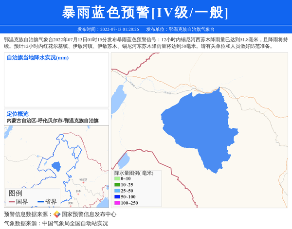 鄂温克族自治旗气象台2022年07月13日01时15分发布暴雨蓝色预警信号:12小时内锡尼河西苏木降雨量已达到51.8毫米,且降雨将持续。预计12小时内红花尔基镇、伊敏河镇、伊敏苏木、锡尼河东苏木降雨量将达到50毫米。请有关单位和人员做好防范准备。 信息来源:国家预警信息发布中心; 发布单位:鄂温克族自治旗气象台。