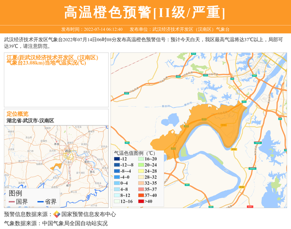 武汉经济技术开发区气象台2022年07月14日06时08分发布高温橙色预警信号:预计今天白天,我区最高气温将达37℃以上,局部可达39℃,请注意防范。 信息来源:国家预警信息发布中心; 发布单位:武汉经济技术开发区(汉南区)气象台。
