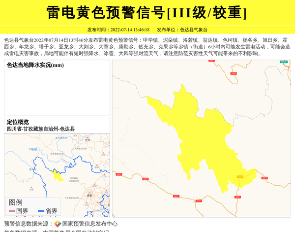 色达县气象台2022年07月14日13时46分发布雷电黄色预警信号:甲学镇、泥朵镇、洛若镇、翁达镇、色柯镇、杨各乡、旭日乡、霍西乡、年龙乡、塔子乡、亚龙乡、大则乡、大章乡、康勒乡、然充乡、克果乡等乡镇(街道)6小时内可能发生雷电活动,可能会造成雷电灾害事故,局地可能伴有短时强降水、冰雹、大风等强对流天气,请注意防范灾害性天气可能带来的不利影响。 信息来源:国家预警信息发布中心; 发布单位:色达县气象台。