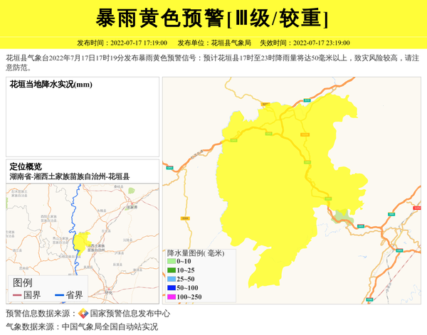 花垣县气象台2022年7月17日17时19分发布暴雨黄色预警信号:预计花垣县17时至23时降雨量将达50毫米以上,致灾风险较高,请注意防范。 信息来源:国家预警信息发布中心; 发布单位:花垣县气象局。