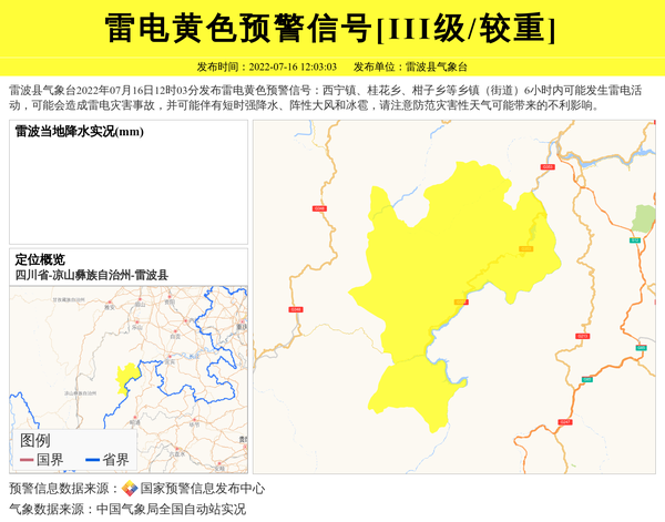 雷波县气象台2022年07月16日12时03分发布雷电黄色预警信号:西宁镇、桂花乡、柑子乡等乡镇(街道)6小时内可能发生雷电活动,可能会造成雷电灾害事故,并可能伴有短时强降水、阵性大风和冰雹,请注意防范灾害性天气可能带来的不利影响。 信息来源:国家预警信息发布中心; 发布单位:雷波县气象台。