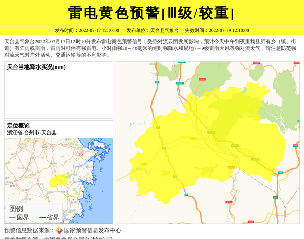 天台县气象台2022年07月17日12时10分发布雷电黄色预警信号:受强对流云团发展影响,预计今天中午到夜里我县所有乡(镇、街道)有阵雨或雷雨,雷雨时可伴有强雷电、小时雨强20~40毫米的短时强降水和局地7~9级雷雨大风等强对流天气,请注意防范强对流天气对户外活动、交通运输等的不利影响。 信息来源:国家预警信息发布中心; 发布单位:天台县气象台。