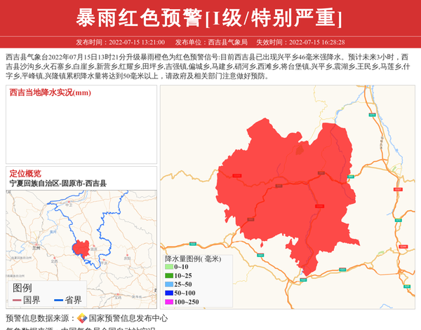 西吉县气象台2022年07月15日13时21分升级暴雨橙色为红色预警信号:目前西吉县已出现兴平乡46毫米强降水。预计未来3小时,西吉县沙沟乡,火石寨乡,白崖乡,新营乡,红耀乡,田坪乡,吉强镇,偏城乡,马建乡,硝河乡,西滩乡,将台堡镇,兴平乡,震湖乡,王民乡,马莲乡,什字乡,平峰镇,兴隆镇累积降水量将达到50毫米以上,请政府及相关部门注意做好预防。 信息来源:国家预警信息发布中心; 发布单位:西吉县气象局。