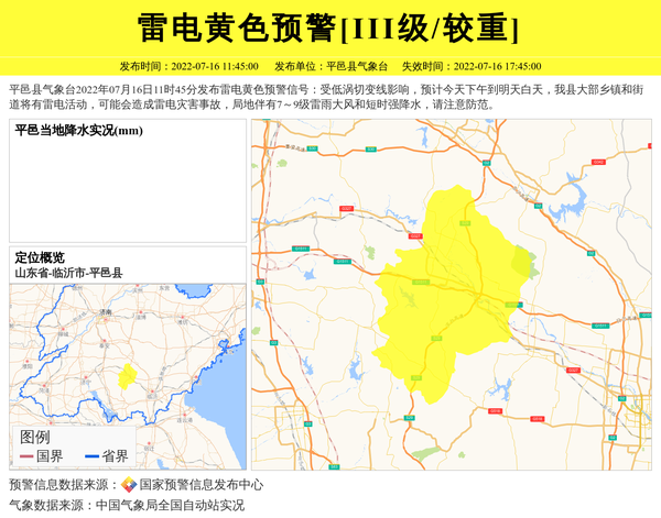 平邑县气象台2022年07月16日11时45分发布雷电黄色预警信号:受低涡切变线影响,预计今天下午到明天白天,我县大部乡镇和街道将有雷电活动,可能会造成雷电灾害事故,局地伴有7~9级雷雨大风和短时强降水,请注意防范。 信息来源:国家预警信息发布中心; 发布单位:平邑县气象台。