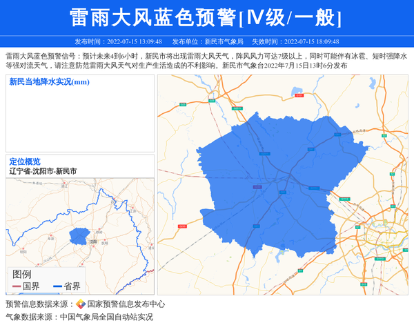 雷雨大风蓝色预警信号:预计未来4到6小时,新民市将出现雷雨大风天气,阵风风力可达7级以上,同时可能伴有冰雹、短时强降水等强对流天气,请注意防范雷雨大风天气对生产生活造成的不利影响。新民市气象台2022年7月15日13时6分发布 信息来源:国家预警信息发布中心; 发布单位:新民市气象局。