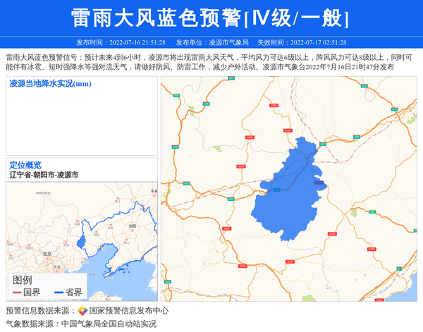 雷雨大风蓝色预警信号:预计未来4到6小时,凌源市将出现雷雨大风天气,平均风力可达6级以上,阵风风力可达8级以上,同时可能伴有冰雹、短时强降水等强对流天气,请做好防风、防雷工作,减少户外活动。凌源市气象台2022年7月16日21时47分发布 信息来源:国家预警信息发布中心; 发布单位:凌源市气象局。