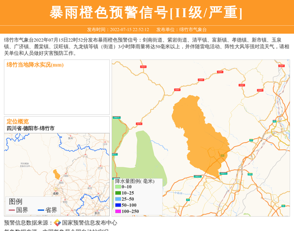 绵竹市气象台2022年07月15日22时52分发布暴雨橙色预警信号:剑南街道、紫岩街道、清平镇、富新镇、孝德镇、新市镇、玉泉镇、广济镇、麓棠镇、汉旺镇、九龙镇等镇(街道)3小时降雨量将达50毫米以上,并伴随雷电活动、阵性大风等强对流天气,请相关单位和人员做好灾害预防工作。 信息来源:国家预警信息发布中心; 发布单位:绵竹市气象台。