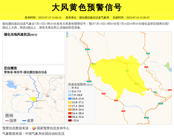 循化撒拉族自治县气象台7月15日13时45分发布大风黄色预警信号:预计7月15日13时45分至7月16日01时45分循化县积石镇将出现7级以上大风,阵风8级以上,请有关单位和人员做好防范准备。 信息来源:国家预警信息发布中心; 发布单位:循化撒拉族自治县气象局。
