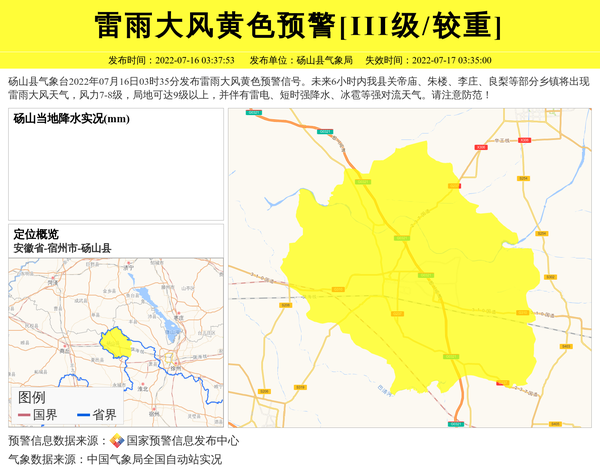 砀山县气象台2022年07月16日03时35分发布雷雨大风黄色预警信号。未来6小时内我县关帝庙、朱楼、李庄、良梨等部分乡镇将出现雷雨大风天气,风力7-8级,局地可达9级以上,并伴有雷电、短时强降水、冰雹等强对流天气。请注意防范! 信息来源:国家预警信息发布中心; 发布单位:砀山县气象局。