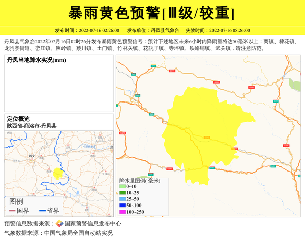 丹凤县气象台2022年07月16日02时26分发布暴雨黄色预警信号:预计下述地区未来6小时内降雨量将达50毫米以上:商镇、棣花镇、龙驹寨街道、峦庄镇、庾岭镇、蔡川镇、土门镇、竹林关镇、花瓶子镇、寺坪镇、铁峪铺镇、武关镇,请注意防范。 信息来源:国家预警信息发布中心; 发布单位:丹凤县气象台。