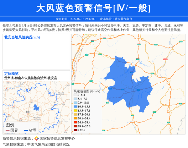瓮安县气象台7月16日9时42分继续发布大风蓝色预警信号:预计未来24小时我县中坪、天文、岚关、平定营、建中、县城、永和等乡镇将受大风影响,平均风力可达6级,阵风7级并可能持续,建议停止高空作业和水上作业,其他相关行业和个人也要注意防范。 信息来源:国家预警信息发布中心; 发布单位:瓮安县气象台。