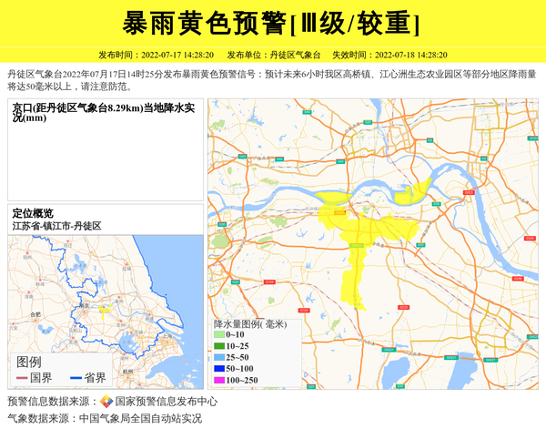 丹徒区气象台2022年07月17日14时25分发布暴雨黄色预警信号:预计未来6小时我区高桥镇、江心洲生态农业园区等部分地区降雨量将达50毫米以上,请注意防范。 信息来源:国家预警信息发布中心; 发布单位:丹徒区气象台。