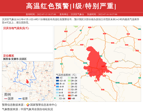 汉滨区气象台2022年07月15日10时37分继续发布高温红色预警信号:预计我区大部分镇办及恒口示范区未来24小时内最高气温将升至40℃以上,请注意防范。 信息来源:国家预警信息发布中心; 发布单位:汉滨区气象台。