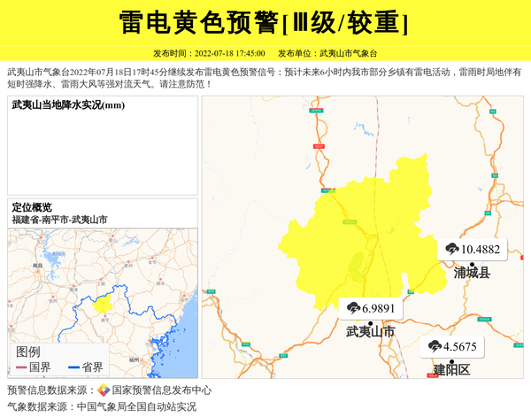 武夷山市气象台2022年07月18日17时45分继续发布雷电黄色预警信号:预计未来6小时内我市部分乡镇有雷电活动,雷雨时局地伴有短时强降水、雷雨大风等强对流天气。请注意防范! 信息来源:国家预警信息发布中心; 发布单位:武夷山市气象台。