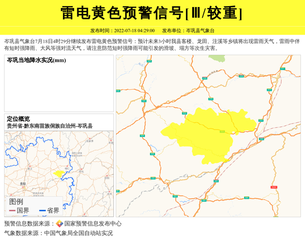岑巩县气象台7月18日4时29分继续发布雷电黄色预警信号:预计未来3小时我县客楼、龙田、注溪等乡镇将出现雷雨天气,雷雨中伴有短时强降雨、大风等强对流天气,请注意防范短时强降雨可能引发的滑坡、塌方等次生灾害。 信息来源:国家预警信息发布中心; 发布单位:岑巩县气象台。
