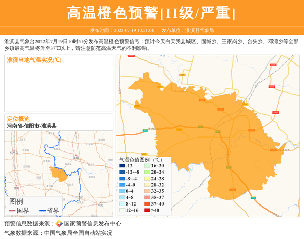 淮滨县气象台2022年7月19日10时51分发布高温橙色预警信号:预计今天白天我县城区、固城乡、王家岗乡、台头乡、邓湾乡等全部乡镇最高气温将升至37℃以上,请注意防范高温天气的不利影响。 信息来源:国家预警信息发布中心; 发布单位:淮滨县气象局。