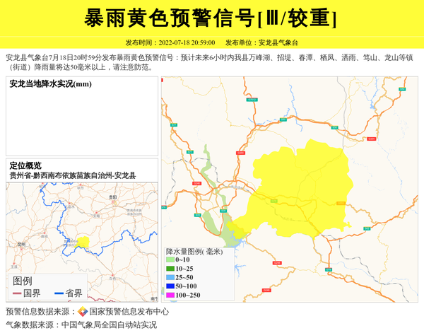 安龙县气象台7月18日20时59分发布暴雨黄色预警信号:预计未来6小时内我县万峰湖、招堤、春潭、栖凤、洒雨、笃山、龙山等镇(街道)降雨量将达50毫米以上,请注意防范。 信息来源:国家预警信息发布中心; 发布单位:安龙县气象台。