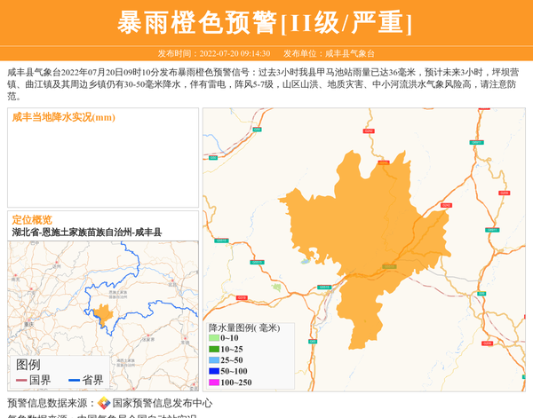 咸丰县气象台发布暴雨橙色预警[II级/严重]