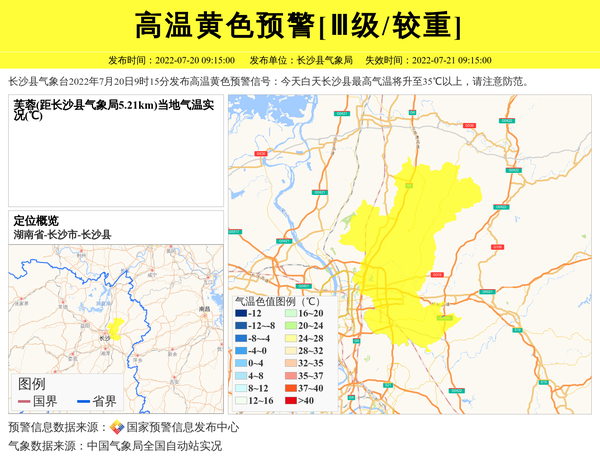 长沙县气象台2022年7月20日9时15分发布高温黄色预警信号:今天白天长沙县最高气温将升至35℃以上,请注意防范。 信息来源:国家预警信息发布中心; 发布单位:长沙县气象局。