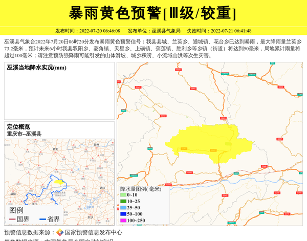 巫溪县气象台2022年7月20日06时20分发布暴雨黄色预警信号:我县县城、兰英乡、通城镇、花台乡已达到暴雨,最大降雨量兰英乡73.2毫米,预计未来6小时我县双阳乡、菱角镇、天星乡、上磺镇、蒲莲镇、胜利乡等乡镇(街道)将达到50毫米,局地累计雨量将超过100毫米;请注意预防强降雨可能引发的山体滑坡、城乡积涝、小流域山洪等次生灾害。 信息来源:国家预警信息发布中心; 发布单位:巫溪县气象局。