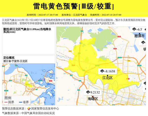 江北区气象台2022年7月17日20时57分将雷电橙色预警信号调整为雷电黄色预警信号:受对流云团影响,预计今天夜里我区仍有分散性阵雨或雷雨,雷雨时可伴有强雷电、短时强降水和局地雷雨大风,请继续做好强对流天气的防范工作。 信息来源:国家预警信息发布中心; 发布单位:江北区气象台。