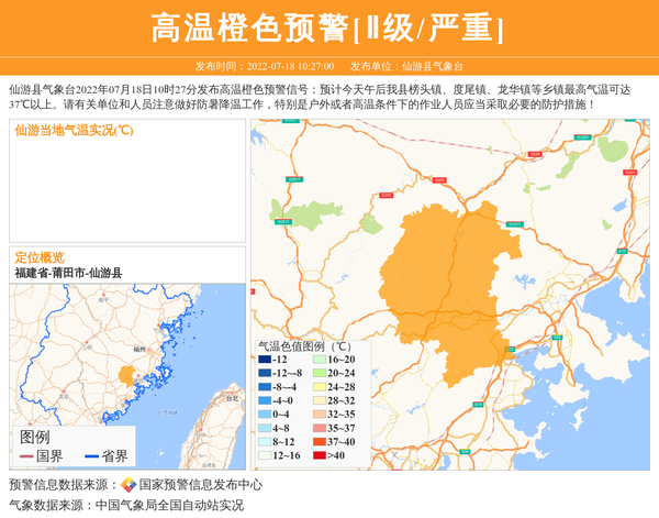 仙游县气象台2022年07月18日10时27分发布高温橙色预警信号:预计今天午后我县榜头镇、度尾镇、龙华镇等乡镇最高气温可达37℃以上。请有关单位和人员注意做好防暑降温工作,特别是户外或者高温条件下的作业人员应当采取必要的防护措施! 信息来源:国家预警信息发布中心; 发布单位:仙游县气象台。
