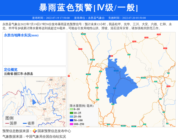 永胜县气象台2022年7月19日17时50分发布暴雨蓝色预警信号:预计未来12小时,我县松坪、光华、三川、大安、六德、仁和、永北、羊坪等乡镇累计降水量将达到或超过50毫米,可能会引发局地性山洪、滑坡、泥石流等灾害,请加强相关防范工作。 信息来源:国家预警信息发布中心; 发布单位:永胜县气象台。