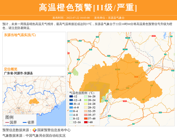 预计,未来一周我县晴热高温天气维持,最高气温将接近或达到37℃,东源县气象台于22日10时00分将高温黄色预警信号升级为橙色,请注意防暑降温。 信息来源:国家预警信息发布中心; 发布单位:东源县气象台。