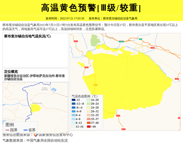 察布查尔锡伯自治县气象局2022年7月21日17时3分发布高温黄色预警信号:预计今日至27日,察布查尔县平原地区将出现35℃以上的高温天气,局地最高气温可达37℃以上,高温持续时间长,注意防暑降温。 信息来源:国家预警信息发布中心; 发布单位:察布查尔锡伯自治县气象局。