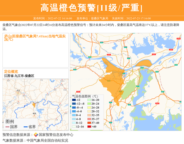 柴桑区气象台2022年07月22日14时16分发布高温橙色预警信号:预计未来24小时内,柴桑区最高气温将达37°C以上,请注意防暑降温。 信息来源:国家预警信息发布中心; 发布单位:柴桑区气象局。