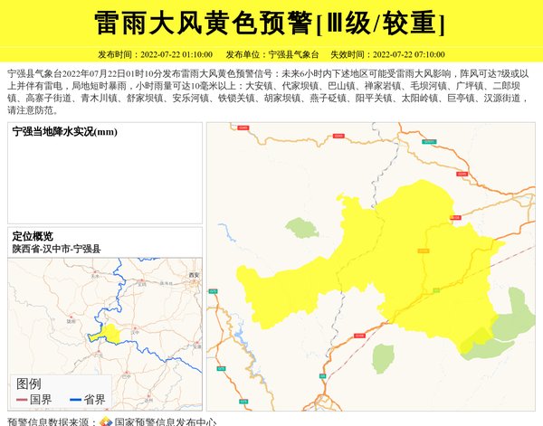 宁强县气象台2022年07月22日01时10分发布雷雨大风黄色预警信号:未来6小时内下述地区可能受雷雨大风影响,阵风可达7级或以上并伴有雷电,局地短时暴雨,小时雨量可达10毫米以上:大安镇、代家坝镇、巴山镇、禅家岩镇、毛坝河镇、广坪镇、二郎坝镇、高寨子街道、青木川镇、舒家坝镇、安乐河镇、铁锁关镇、胡家坝镇、燕子砭镇、阳平关镇、太阳岭镇、巨亭镇、汉源街道,请注意防范。 信息来源:国家预警信息发布中心; 发布单位:宁强县气象台。