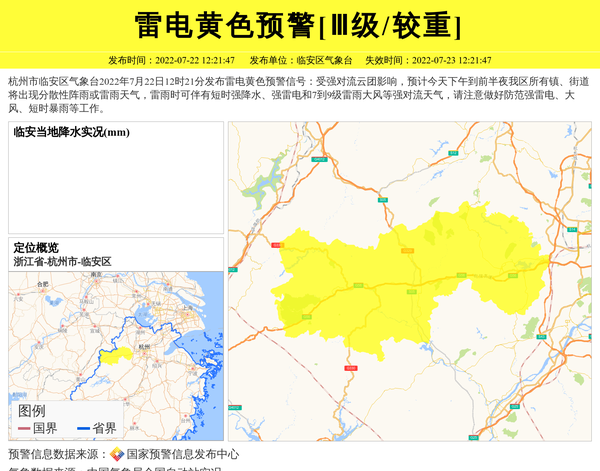 杭州市临安区气象台2022年7月22日12时21分发布雷电黄色预警信号:受强对流云团影响,预计今天下午到前半夜我区所有镇、街道将出现分散性阵雨或雷雨天气,雷雨时可伴有短时强降水、强雷电和7到9级雷雨大风等强对流天气,请注意做好防范强雷电、大风、短时暴雨等工作。 信息来源:国家预警信息发布中心; 发布单位:临安区气象台。