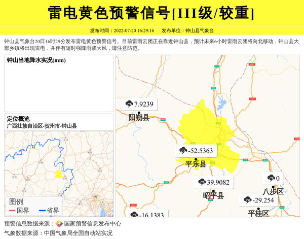 钟山县气象台20日16时29分发布雷电黄色预警信号。目前雷雨云团正在靠近钟山县,预计未来6小时雷雨云团将向北移动,钟山县大部乡镇将出现雷电,并伴有短时强降雨或大风,请注意防范。 信息来源:国家预警信息发布中心; 发布单位:钟山县气象台。