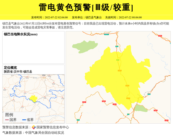 镇巴县气象台2022年07月22日02时04分发布雷电黄色预警信号:目前我县已出现雷电活动,预计未来6小时内我县所有镇(办)仍可能发生雷电活动,可能会造成雷电灾害事故,请注意防范。 信息来源:国家预警信息发布中心; 发布单位:镇巴县气象台。