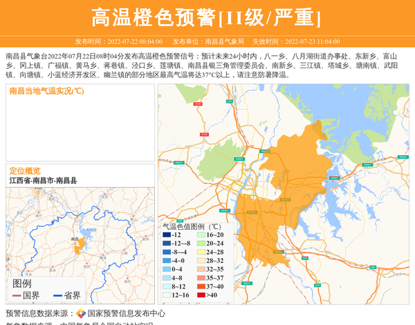 南昌县气象台2022年07月22日08时04分发布高温橙色预警信号:预计未来24小时内,八一乡、八月湖街道办事处、东新乡、富山乡、冈上镇、广福镇、黄马乡、蒋巷镇、泾口乡、莲塘镇、南昌县银三角管理委员会、南新乡、三江镇、塔城乡、塘南镇、武阳镇、向塘镇、小蓝经济开发区、幽兰镇的部分地区最高气温将达37°C以上,请注意防暑降温。 信息来源:国家预警信息发布中心; 发布单位:南昌县气象局。
