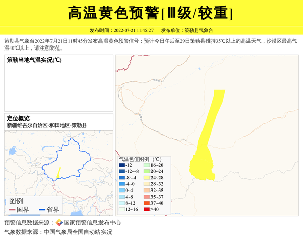 策勒县气象台2022年7月21日11时45分发布高温黄色预警信号:预计今日午后至29日策勒县维持35℃以上的高温天气,沙漠区最高气温40℃以上,请注意防范。 信息来源:国家预警信息发布中心; 发布单位:策勒县气象台。