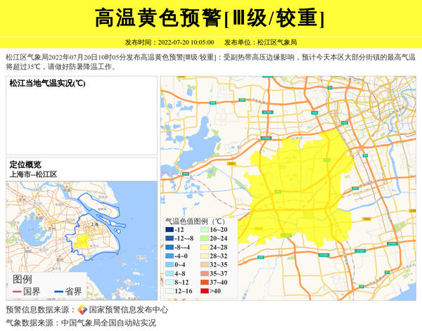 松江区气象局2022年07月20日10时05分发布高温黄色预警[Ⅲ级/较重]:受副热带高压边缘影响,预计今天本区大部分街镇的最高气温将超过35℃,请做好防暑降温工作。 信息来源:国家预警信息发布中心; 发布单位:松江区气象局。