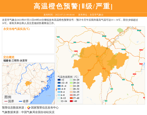 永安市气象台2022年07月21日09时40分继续发布高温橙色预警信号:预计今天午后我市最高气温可达35~38℃,部分乡镇超过38℃。请有关单位和人员注意做好防暑降温工作。 信息来源:国家预警信息发布中心; 发布单位:永安市气象台。