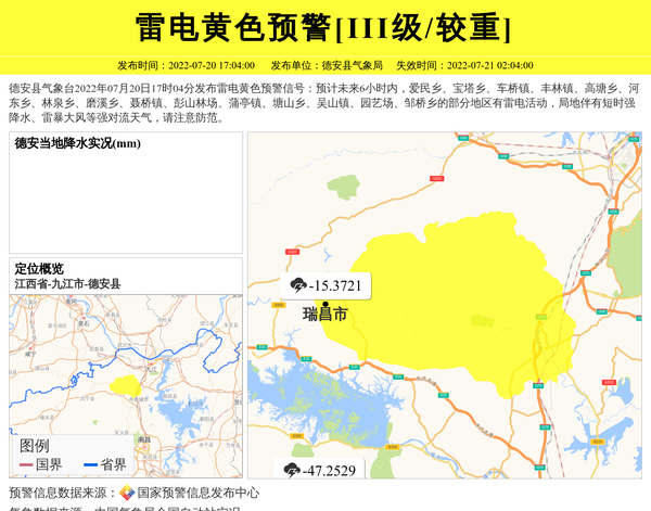 德安县气象台2022年07月20日17时04分发布雷电黄色预警信号:预计未来6小时内,爱民乡、宝塔乡、车桥镇、丰林镇、高塘乡、河东乡、林泉乡、磨溪乡、聂桥镇、彭山林场、蒲亭镇、塘山乡、吴山镇、园艺场、邹桥乡的部分地区有雷电活动,局地伴有短时强降水、雷暴大风等强对流天气,请注意防范。 信息来源:国家预警信息发布中心; 发布单位:德安县气象局。