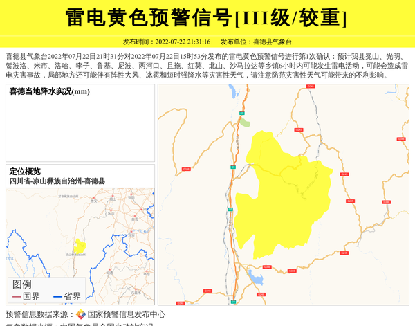 喜德县气象台2022年07月22日21时31分对2022年07月22日15时53分发布的雷电黄色预警信号进行第1次确认:预计我县冕山、光明、贺波洛、米市、洛哈、李子、鲁基、尼波、两河口、且拖、红莫、北山、沙马拉达等乡镇6小时内可能发生雷电活动,可能会造成雷电灾害事故,局部地方还可能伴有阵性大风、冰雹和短时强降水等灾害性天气,请注意防范灾害性天气可能带来的不利影响。 信息来源:国家预警信息发布中心; 发布单位:喜德县气象台。