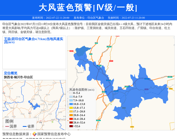印台区气象台2022年07月22日11时20分发布大风蓝色预警信号:目前我区金锁关镇已出现6~8级大风,预计下述地区未来24小时内将受大风影响,平均风力可达6级以上(阵风7级以上):陈炉镇、三里洞街道、城关街道、王石凹街道、广阳镇、印台街道、红土镇、阿庄镇、金锁关镇,请注意防范。 信息来源:国家预警信息发布中心; 发布单位:印台区气象台。