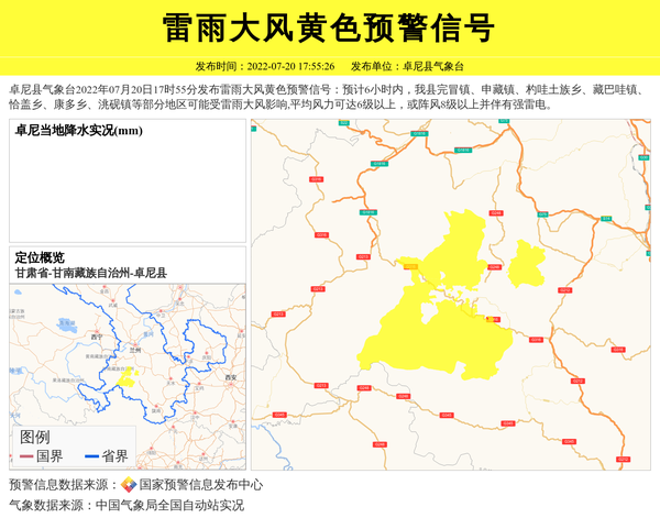 卓尼县气象台2022年07月20日17时55分发布雷雨大风黄色预警信号:预计6小时内,我县完冒镇、申藏镇、杓哇土族乡、藏巴哇镇、恰盖乡、康多乡、洮砚镇等部分地区可能受雷雨大风影响,平均风力可达6级以上,或阵风8级以上并伴有强雷电。 信息来源:国家预警信息发布中心; 发布单位:卓尼县气象台。