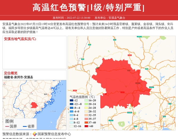 安溪县气象台2022年07月22日13时30分变更发布高温红色预警信号:预计未来24小时我县官桥镇、蓬莱镇、金谷镇、湖头镇、剑斗镇、福田乡等部分乡镇最高气温将达40℃以上。请有关单位和人员注意做好防暑降温工作,特别是户外或者高温条件下的作业人员应当采取必要的防护措施! 信息来源:国家预警信息发布中心; 发布单位:安溪县气象台。