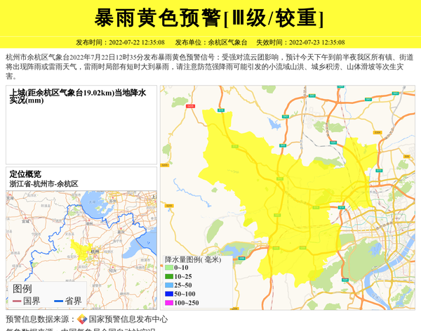 杭州市余杭区气象台2022年7月22日12时35分发布暴雨黄色预警信号:受强对流云团影响,预计今天下午到前半夜我区所有镇、街道将出现阵雨或雷雨天气,雷雨时局部有短时大到暴雨,请注意防范强降雨可能引发的小流域山洪、城乡积涝、山体滑坡等次生灾害。 信息来源:国家预警信息发布中心; 发布单位:余杭区气象台。