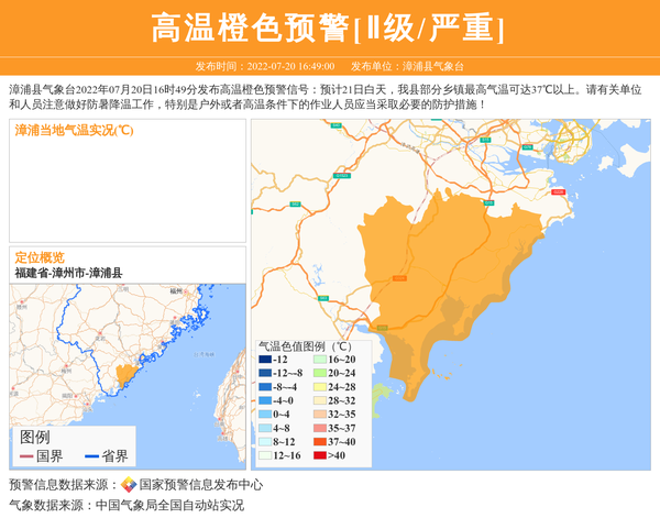 漳浦县气象台2022年07月20日16时49分发布高温橙色预警信号:预计21日白天,我县部分乡镇最高气温可达37℃以上。请有关单位和人员注意做好防暑降温工作,特别是户外或者高温条件下的作业人员应当采取必要的防护措施! 信息来源:国家预警信息发布中心; 发布单位:漳浦县气象台。