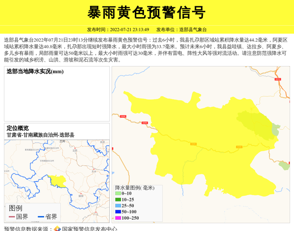 迭部县气象台2022年07月21日23时13分继续发布暴雨黄色预警信号:过去6小时,我县扎尕那区域站累积降水量达44.2毫米,阿夏区域站累积降水量达40.8毫米,扎尕那出现短时强降水,最大小时雨强为33.7毫米。预计未来6小时,我县益哇镇、达拉乡、阿夏乡、多儿乡有暴雨,局部雨量可达50毫米以上,最大小时雨强可达30毫米,并伴有雷电、阵性大风等强对流活动。请注意防范强降水可能引发的城乡积涝、山洪、滑坡和泥石流等次生灾害。 信息来源:国家预警信息发布中心; 发布单位:迭部县气象台。